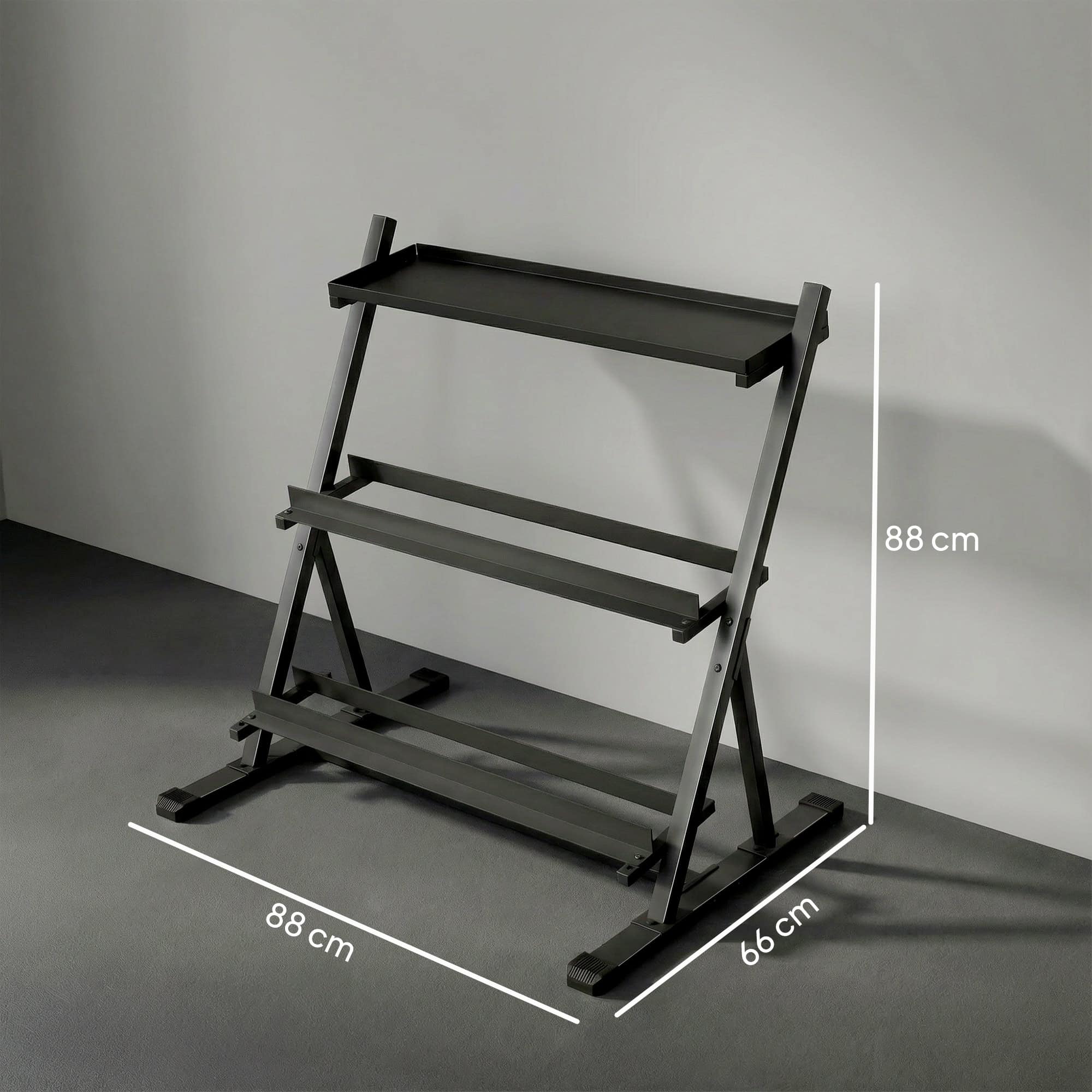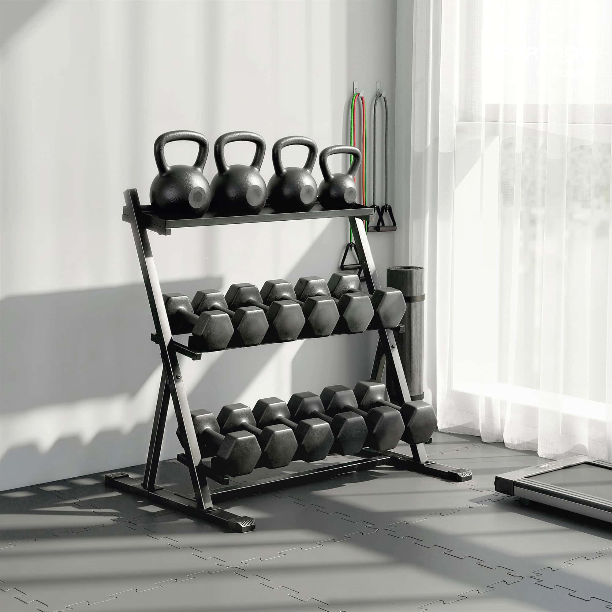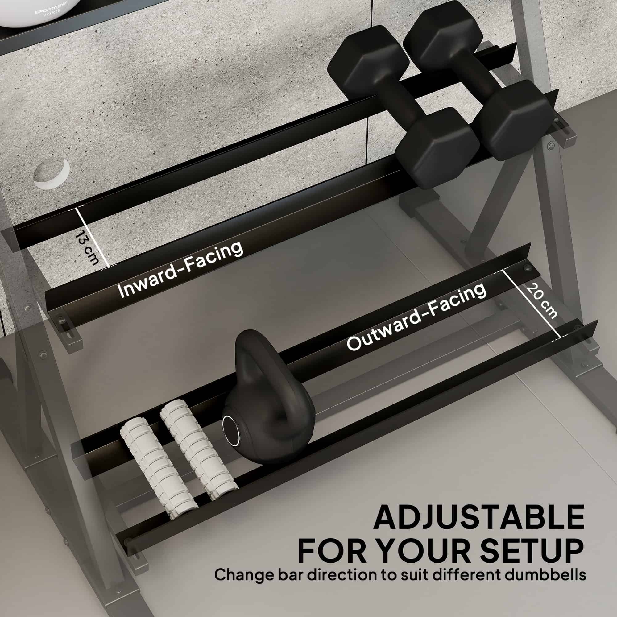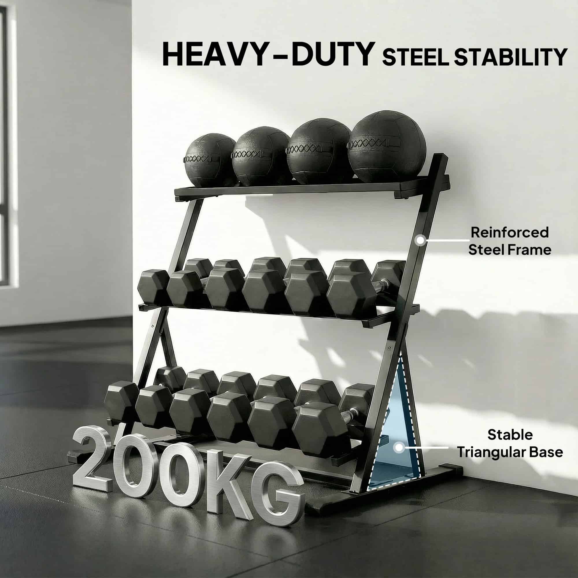 - Safely supports up to 200kg, easily holding a full set of dumbbells