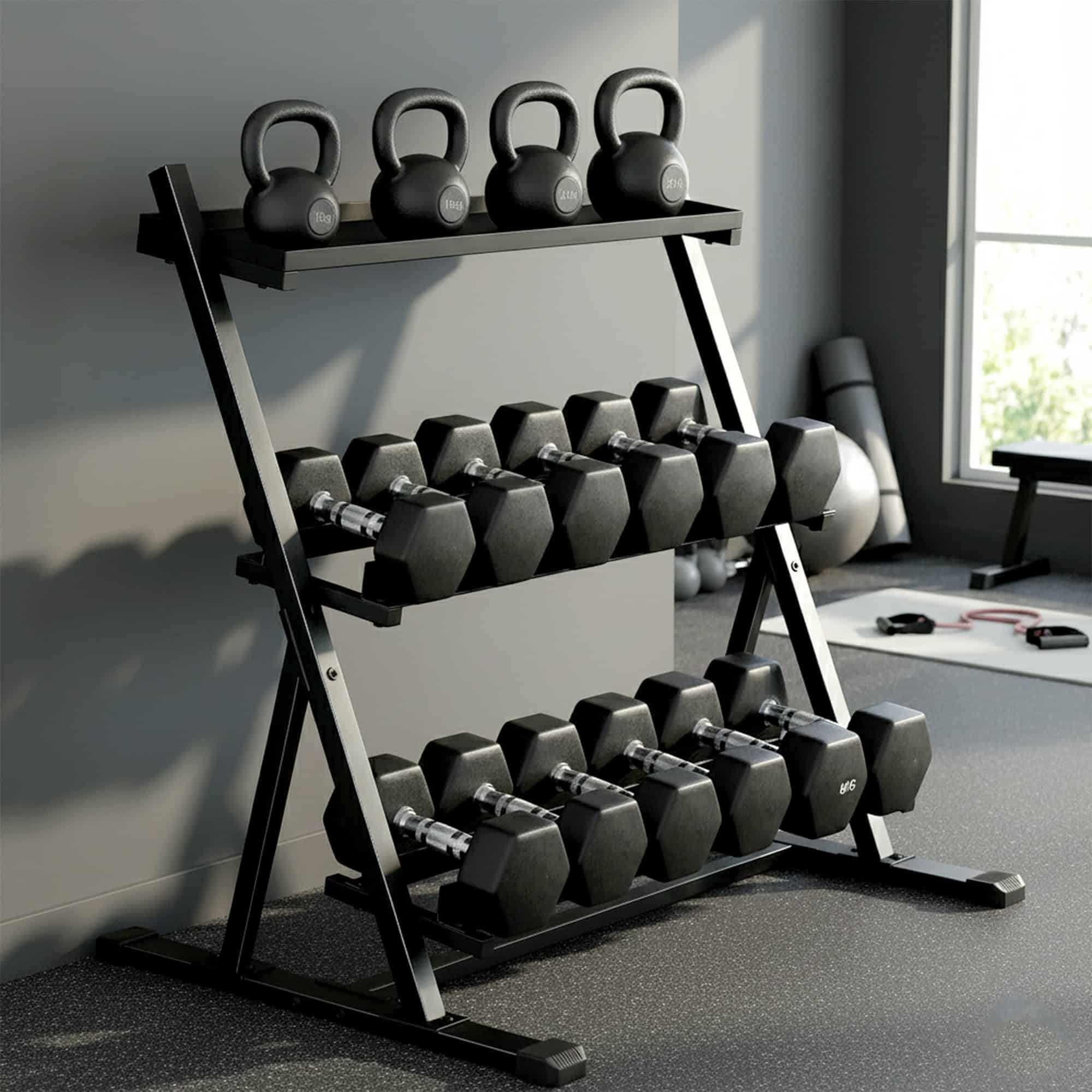 - The 3-tier angled design provides quick access to weights during workouts